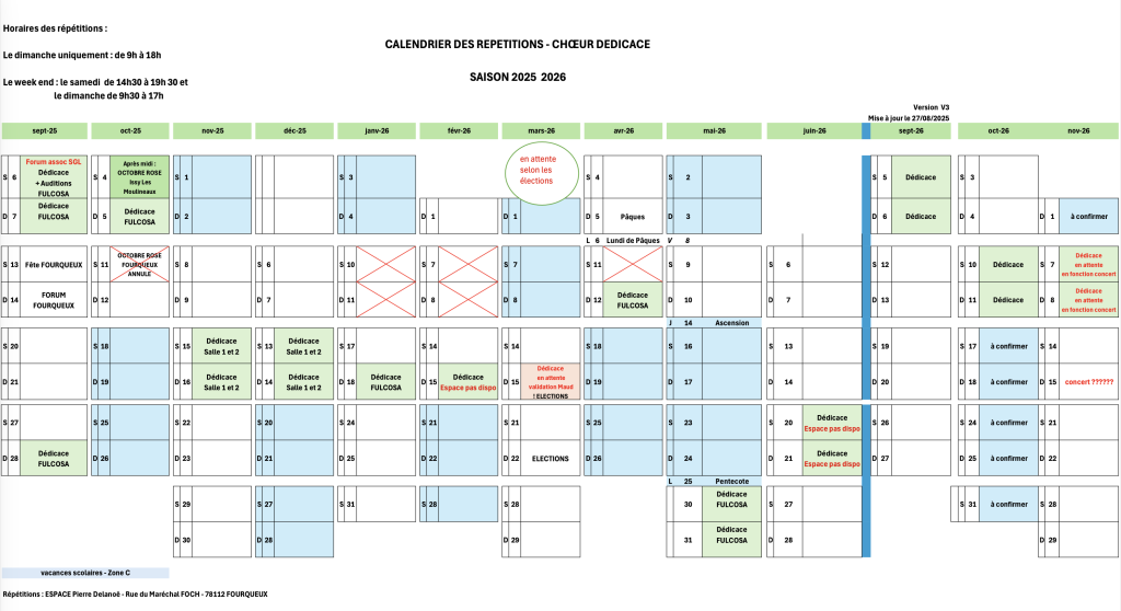 Le week-end du 6-7 septembre, le chœur Dédicace a repris l’apprentissage de nouveaux chants pour son spectacle 2026, en présence de 17 nouveaux choristes auditionnés le samedi soir et que viendront peut-être compléter quelques candidats lors de la deuxième audition du dimanche 28 septembre (14h à Fourqueux, Espace Pierre Delanoë).
